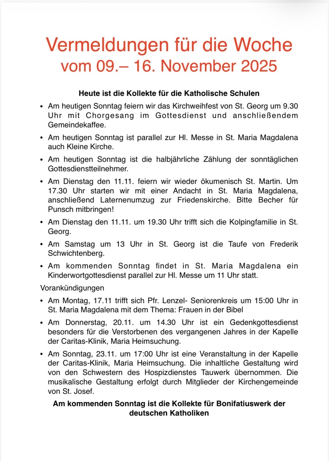 Die Angaben sind gegebenenfalls kurzfristigen Änderungen unterworfen. Fragen Sie beim Pfarrer oder mittwochs am Vormittag im Pfarrbüro nach.